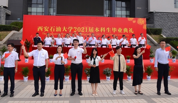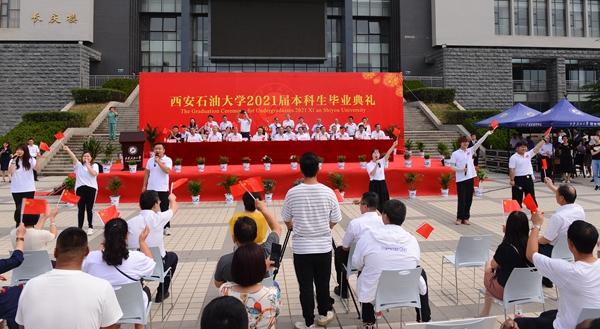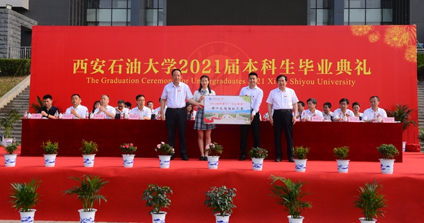 副校长陈军斌宣读了《beat365正版唯一官网关于2021届本科学生准予毕业、颁发毕业证和授予学士学位的决定》,副校长杨战社宣读了《beat365正版唯一官网关于表彰2021届优秀毕业生的决定》,校党委副书记雷西合宣读了《beat365正版唯一官网校友总会关于聘任2021届年级校友理事的决定》。与会校领导为优秀毕业生代表颁发了荣誉证书,为年级理事代表颁发了聘任证书和纪念品,并向毕业生代表赠送了“原油”印章纪念品。