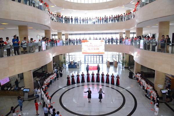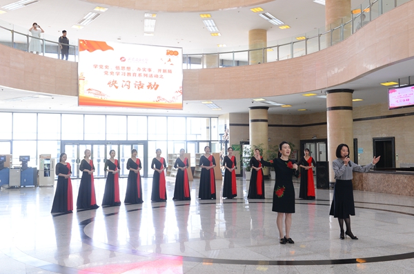 音乐系教师陈俊凤、寇利利与合唱团演唱《唱支山歌给党听》