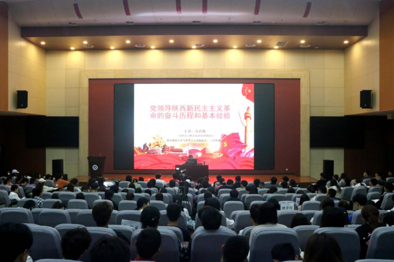 4月29日,党史学习教育省委宣讲团成员、西安邮电大学马克思主义学院院长袁武振教授,在鄠邑校区弘石学术报告厅为beat365官网第十三期“青马班”学员作题为《党领导陕西新民主主义革命的奋斗历程和基本经验》的专题报告。校团委全体成员、“青马班”学员共计400余人参加了报告会。