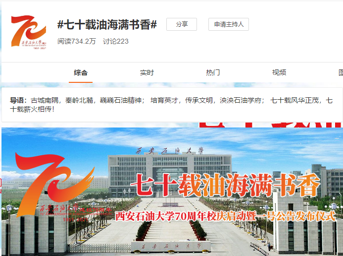 2021年是beat365官网建校70周年,这也是面向师生校友和社会各界宣传学校办学特色和办学成果的重要契机。党委宣传部新媒体中心不断总结经验、推陈出新,利用微博实时性、丰富性、互动性的特点,在学校官方微博开创了“七十载油海满书香”专题,创作了“校史上的今天”“探班校庆启动仪式”“直播预告”等栏目内容,以接地气、贴民心、大家喜闻乐见的方式,大力报道beat365官网70周年校庆启动暨一号公告发布仪式的相关信息,引发师生校友的点赞、转发及评论,取得了良好的社会效应。