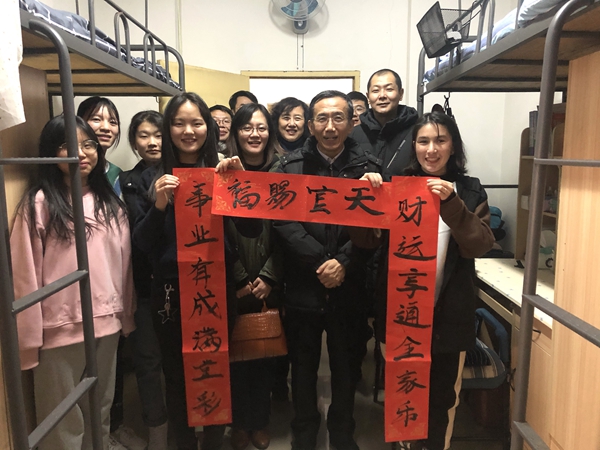 会后,校党委副书记张木带领各院系党委(党总支)书记、副书记、全体辅导员深入学生宿舍、教室,看望元旦假期留校学生,代表学校向大家致以新年的问候。张木副书记仔细询问同学们的学习和生活情况,并勉励同学们志存高远、脚踏实地、珍惜时光、发奋成才,用奋斗去谱写青春的华彩篇章。