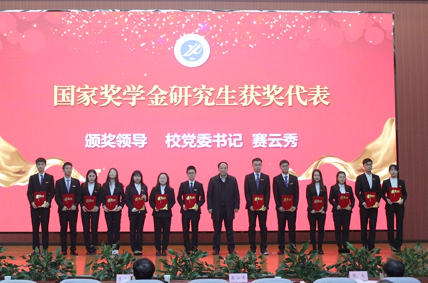 赛云秀书记为获得2020年国家奖学金的本科生、研究生代表以及2020年校级“十佳大学生”称号的学生颁发荣誉证书。