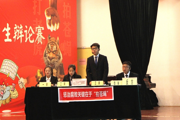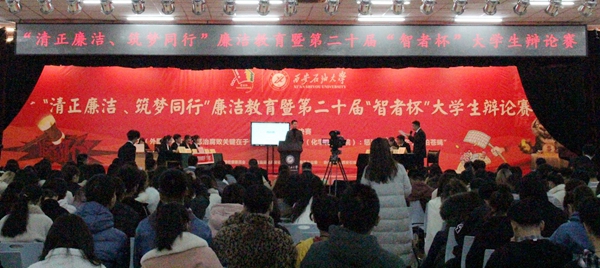 外国语学院和化学化工学院两支代表队以“惩治腐败关键在于‘打老虎’还是‘拍苍蝇’”为辩题,展开了辩论,唇枪舌剑,精彩纷呈。在场下观众提问环节,在场的同学们也积极参与了辩论。最终,外国语学院获得第二十届“智者杯”辩论赛冠军,化学化工学院获得亚军,石油工程学院和电子工程学院获得季军。马克思主义学院副院长张海涛代表评委团对冠军争夺赛作了点评。他谈到,在惩治腐败中,“打老虎”和“拍苍蝇”同等重要,辩题的设置体现了唯物史观视域下坚持“两点论”和“重点论”的辩证统一,对同学们深刻理解“不敢腐、不能腐、不想腐”的体制机制建设,牢固树立廉洁自律意识具有重要意义。