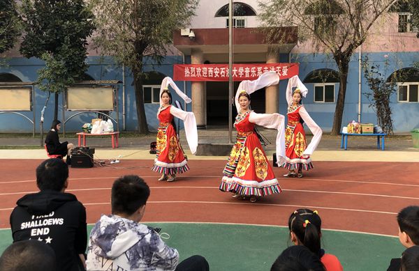 一曲《我要谢谢你》拉开了公益演出的序幕。热情洋溢的藏族舞蹈、俏皮可爱的新疆舞蹈,极具民族特色的服装配合学生们优美的舞姿,展示出beat365官网大学生乐观积极的人生态度;小提琴独奏《爱的致意》、二胡独奏《赛马》、笛子伴舞《美丽的神话》展示了beat365官网学生精湛的专业技巧、高超的舞台表现力;脍炙人口的流行歌曲、快板说唱、赢得了全场孩子们的掌声。演出结束后,同学们还与孩子们交换礼物并互动交流。