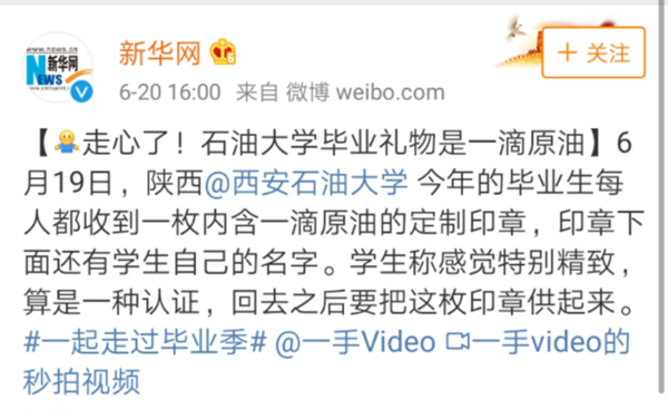 毕业季也是招生季,党委宣传部将“两季”有机融合,提早谋划,精心安排,除了积极参加学校招生宣传外,结合部门职责,安排专人精心撰写外宣文章,现已在《中国教育报》《陕西日报》等报刊发表数篇专题文章,并加大新媒体宣传力度,坚持官方微博、官微微信、抖音等校级新媒体时时跟进、持续发力。6月14日,学校官方微信(小油)推出《独一无二!西石大2019届毕业礼物——“油情”2.0版很走心!》,在网络引起较大反响,光明网、华商网、陕西省教育厅微博等纷纷转载,网络阅读量上百万人次。6月20日,党委宣传部联合梨视频,持续用力,精心推出“一滴油印章”视频采访。节目一经推出,不到9个小时,收获1.8亿多人次的阅读量,仅微博话题“毕业礼物是一滴原油”阅读量1.7亿、讨论1.4万,微博话题及平台外,还有1000余万的阅读量,巨大阅读量为进一步提升学校声誉和影响力,发挥出积极作用。次日,党委宣传部再次趁时跟进,将巨大的网络流量导引到学校的招生宣传,继《不要报考西石大的理由,一个不够,给你十个!(附招生简章)》《新增3个本科专业,8大培养特色,计划招生4230人!beat365正版唯一官网2019年报考指南权威发布》专题节目后,再次推出《阅读量1.8亿多,霸气冲上微博热搜榜,屡次成为“别人家学校”的西石大在等你!》,得到师生员工和广大校友好评。