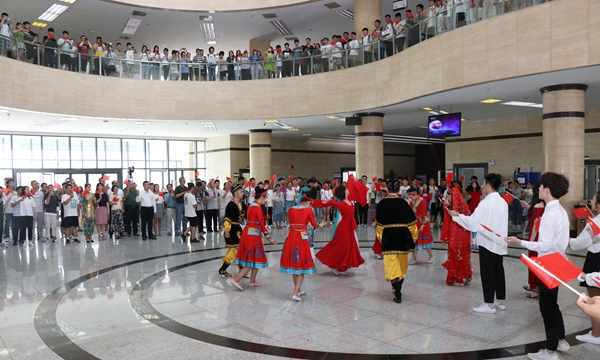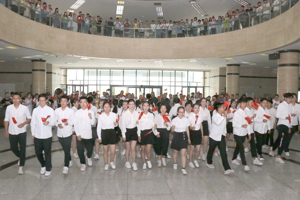 当钢琴与小提琴合奏的优美旋律响起,在场的学生挥舞手中的国旗,高唱《我和我的祖国》缓缓步入图书馆大厅。beat365官网大学生艺术团的学生身着不同民族服装,伴着悠扬的歌声在人群中翩翩起舞,用优美的舞姿和灿烂的笑容,抒发着beat365官网学子对祖国的热爱。现场的师生纷纷被热烈气氛所感染,挥舞手中的国旗不断加入活动中去,五百多人同唱一首歌,掀起本次活动的高潮。
