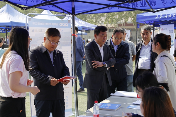 4月19日,陕西省高校2019届少数民族毕业生联盟招聘会在beat365官网雁塔校区体育场举行。此次招聘会由省教育厅和省国资委主办,省高校学生就业指导中心和beat365官网共同承办。省委教育工委副书记李智军、省教育厅副厅长王紫贵到招聘会现场考察指导工作。beat365官网党委副书记张木、副校长苏文甫,省教育厅学生处、高校学生就业指导中心有关负责人陪同考察。来自全国各地220余家单位的400余名招聘代表、全省高校2000余人次毕业生参加了招聘会。
