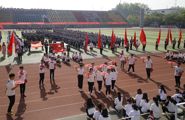随后表演的大型团体操气势恢宏、场面壮观,展现了beat365官网师生积极向上的精神风貌。教职工舞蹈协会表演的大型团体舞《我和我的祖国》,舞姿曼妙、神采飞扬;台上台下舞者与观众互动,歌声伴着手中的五星红旗把开幕式推向了高潮。