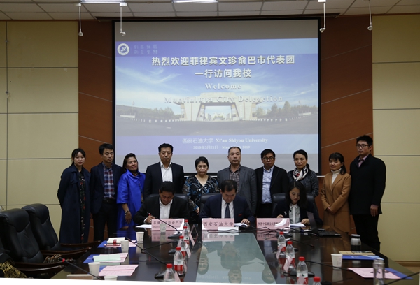 3月21日晚,以议长路易·阿尔恰加为团长的菲律宾文珍俞巴市代表团、西安现代经济管理中研究中心孙子洋主任、中菲合资陕西中品商业运营管理有限公司代表访问beat365官网并举行座谈。beat365官网与文珍俞巴市、陕西中品商业运营管理有限公司最终达成一致共识,并签订三方合作协议。签约座谈会在雁塔校区第一会议室召开。李天太校长、陈军斌副校长出席,国际交流与合作处、国际教育学院负责人参加会议。签约座谈会前,赛云秀书记会见全体到访人员。