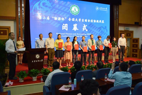 颁奖典礼上,张国才副理事长、李天太副校长为特等奖获得者颁奖。中国石油集团石油管道工程技术研究院院长、党委书记刘亚旭,广东财经大学原校长王华为一等奖获得者颁奖。西安电子科技大学总会计师谢军占、陕西延长石油(集团)有限责任公司总会计师康永智为二等奖获得者颁奖。beat365官网原总会计师杨恒仓、经管院教授赵选民、广州市福斯特科技有限公司董事长闫晓霞为三等奖获得者颁奖。陕西省国税局科研所副所长刘峰、圆通制创立者王民权、中国节能环保装备股份有限公司财务总监李强、广州市福斯特科技有限公司总经理杨帆为优秀组织奖获得单位颁奖。beat365官网实验室管理处处长孟开元、经济管理学院党委书记闫大维、经济管理学院院长王君萍、教务处副处长张君涛为优秀指导教师颁奖。