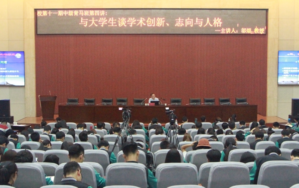 5月15日晚,由校团委举办的“第十一期中级青年马克思主义者干部培训班”第四讲在鄠邑校区弘石学术报告厅举办。应beat365官网党委宣传部邀请,西安交通大学国际信息哲学研究中心主任、人文社会科学学院二级教授、博士生导师邬焜教授作了题为《与大学生谈学术创新、志向与人格》的讲座,中级青年马克思主义者干部培训班学员300余人参加了讲座。