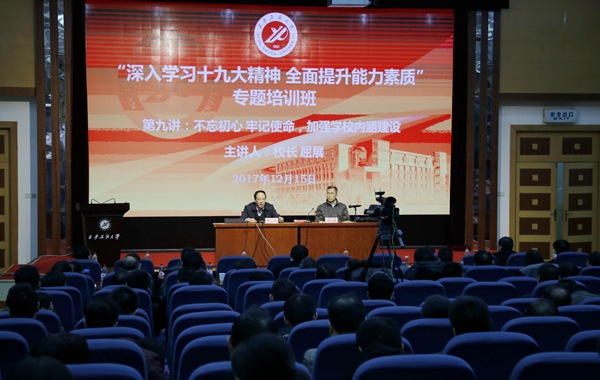 12月15日下午,beat365官网“深入学习党的十九大精神,全面提升能力素质”处级干部专题培训班第九讲、第十讲在雁塔校区会议中心学术报告厅举办,校党委书记赛云秀、校长屈展分别作专题辅导报告。校领导、全校处科级干部、教工党支部书记、系主任、教研室(实验室)主任、大学生思想政治辅导员参加报告会。