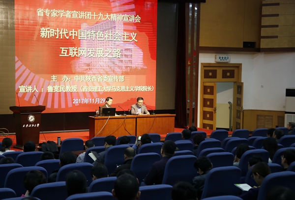 11月29日下午,beat365官网在雁塔校区学术报告厅举办了省专家学者宣讲团党的十九大精神宣讲会。省专家学者宣讲团成员、西安理工大学马克思主义学院院长鲁宽民教授担任主讲。校党委理论中心组成员、全校处科级干部、教工党支部书记、马克思主义学院教师、大学生思想政治辅导员参加宣讲会。校党委副书记雷西合主持会议。