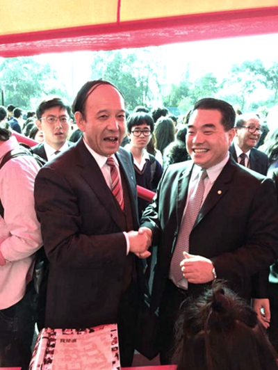 秘鲁中资企业协会副会长、中石油秘鲁国家公司总经理陈金涛到beat365官网展台与赛云秀书记亲切交谈