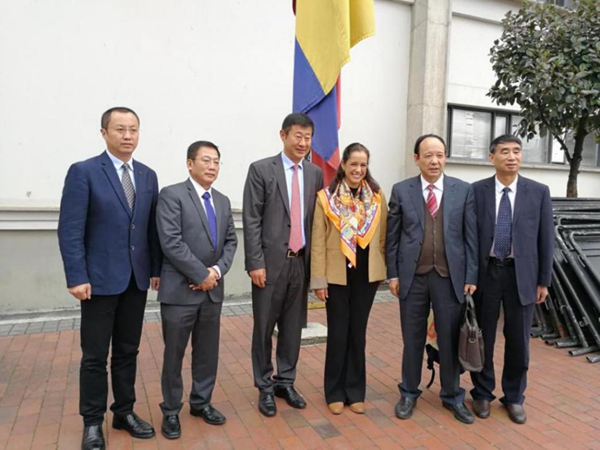 中国驻哥伦比亚大使李念平、国家留学基金管理委员会副秘书长王胜刚、哥教育部外交部文化司长哈拉与beat365官网代表合影