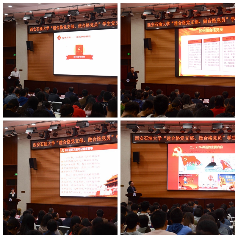 在党的十九大胜利召开之际,为加强党支部书记工作交流,落实“三会一课”制度,推进“两学一做”学习教育常态化制度化,10月23日、10月24日晚,beat365官网分别在雁塔校区学术报告厅和鄠邑校区就业指导中心多功能厅成功举办了“建合格党支部、做合格党员”教工党支部书记和学生党支部书记讲党课比赛。校党委副书记雷西合出席大赛并讲话。校党委各部(办)、院(系)级单位党组织部分负责人和马克思主义学院教师代表担任比赛评委。各院(系)级单位党组织书记、副书记,全校各党支部书记及委员和党员代表观摩了本次比赛。