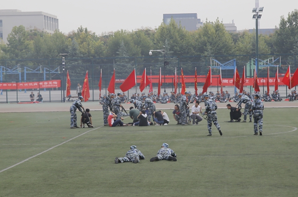 开学典礼暨军训汇报会在激昂的国歌声中拉开了序幕。伴随着嘹亮的口号,2017级新生们在各院(系)辅导员的带领下迈着整齐矫健的步伐,精神饱满地经过主席台,接受校领导的检阅。随后,新生们还进行了擒敌拳方阵、武警舞步操方阵、匕首操方阵、舞旗擒敌配套方阵、战术解救人质演习、石油学子花样队形等科目的表演。