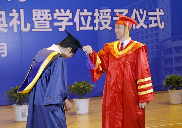 在学位授予仪式上,屈展校长为2017届500余名硕士研究生逐一授予学位、颁发学位证书,并与每一位毕业研究生合影留念。