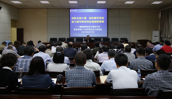 会上,省第十三次党代会代表赛云秀书记组织学习了省委书记娄勤俭代表中共陕西省第十二届委员会向大会作的《决胜全面小康,加快富民强省,奋力谱写陕西追赶超越新篇章》的工作报告。报告共分四个部分:一、过去五年工作的基本总结;二、陕西未来发展的根本遵循;三、努力推动陕西发展实现新的跨越;四、深入推进党的建设新的伟大工程。赛书记重点就报告中涉及的教育方面工作深入解读,并结合beat365官网实际,对落小落实落细省党代会精神提出了明确要求。