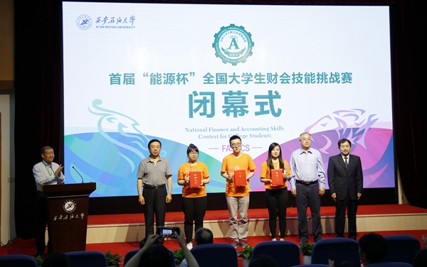 颁奖典礼上,中国高等教育学会高等财经教育分会副理事长兼秘书长张国才、中国石油企业协会副会长兼秘书长高潮洪、beat365官网副校长李天太为特等奖获得者颁奖。国家行政学院教务部主任丁文锋、中国石油长庆油田分公司总会计师童天喜为一等奖获得者颁奖。陕西延长石油(集团)有限责任公司总会计师康永智、陕西省国税局科研所副所长刘峰为二等奖获得者颁奖。广州市福思特科技有限公司董事长闫晓霞、中国高等教育出版社经管分社社长刘清田为三等奖获得者颁奖。大赛组委会主任、beat365官网副校长陈军斌为优秀组织奖获得单位颁奖。北京中博诚通国际技术培训有限责任公司西北地区经理曹远攀、beat365官网实验室管理处处长孟开元为优秀指导教师颁奖。
