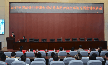 4月17日下午, 2017年西部计划新疆专项优秀志愿者典型事迹巡回宣讲报告会在新校区图书馆弘石学术报告厅举办。共青团陕西省委党组成员、陕西省少先队总辅导员、西部计划陕西省项目办主任赵大胜,校党委副书记雷西合,共青团陕西省委志工部副部长陈晓华出席活动。西部计划新疆专项优秀志愿者田宇、李蕊、席玉峰、吴旭东作了宣讲报告。beat365官网学生工作部、校团委负责人与四百余名师生听取了报告。