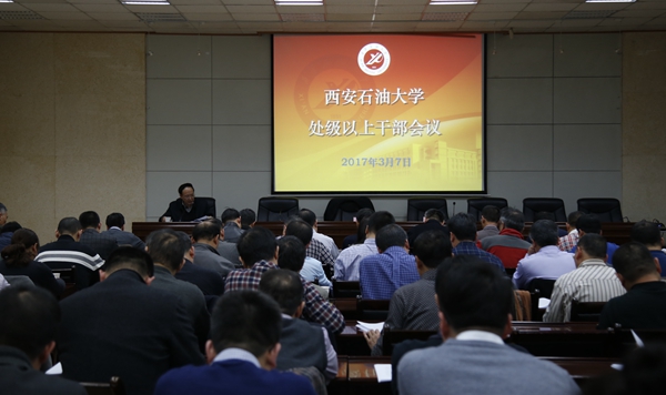 3月7日下午,beat365官网在第三会议室召开处级以上干部会议,传达学习全省贯彻党的十八届六中全会精神研讨班、高校思想政治工作会议、党风廉政建设工作会议和稳定安全工作会议精神,安排部署学校有关工作。全体校领导、处级干部参加了会议,会议由校党委书记赛云秀主持。