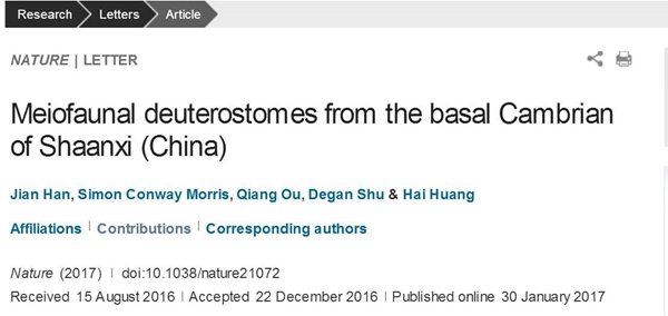 伦敦当地时间1月30日16时(北京时间1月31日0时)在线提前出版的英国《Nature》(自然)杂志,以封面亮点文章的形式,发表了beat365官网石油工程学院黄海副教授与西北大学早期生命研究团队、剑桥大学、中国地质大学(北京)等单位合作研究的重要成果——《陕西寒武纪最早期的微型后口动物》。