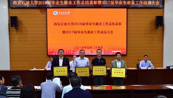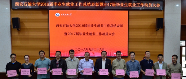 学生工作处处长、就业指导中心主任王宏卫发布了《beat365正版唯一官网2016届毕业生就业工作年度报告》,印发了新修订的《beat365正版唯一官网毕业生就业工作考评奖励办法》(西石大生[2016]171号)。机械工程学院副院长陈子恒、计算机学院辅导员路婷以及石油工程学院辅导员张欢分别代表先进集体、先进个人和2017届毕业生辅导员作了发言。