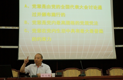 6月15日下午,中共陕西省委党校原副校长、巡视员郑志飚教授应邀来校作了题为《学习党章、实践党章,做合格共产党员》的辅导报告。校领导、全校处科级干部、教工党支部书记和学生党支部书记代表参加了报告会。报告会由校党委副书记张木主持。