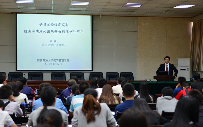 随后,姚峰教授在第三会议室为beat365官网师生作了题为《诺贝尔经济学奖与经济时间序列因果分析的理论和应用》的学术报告。