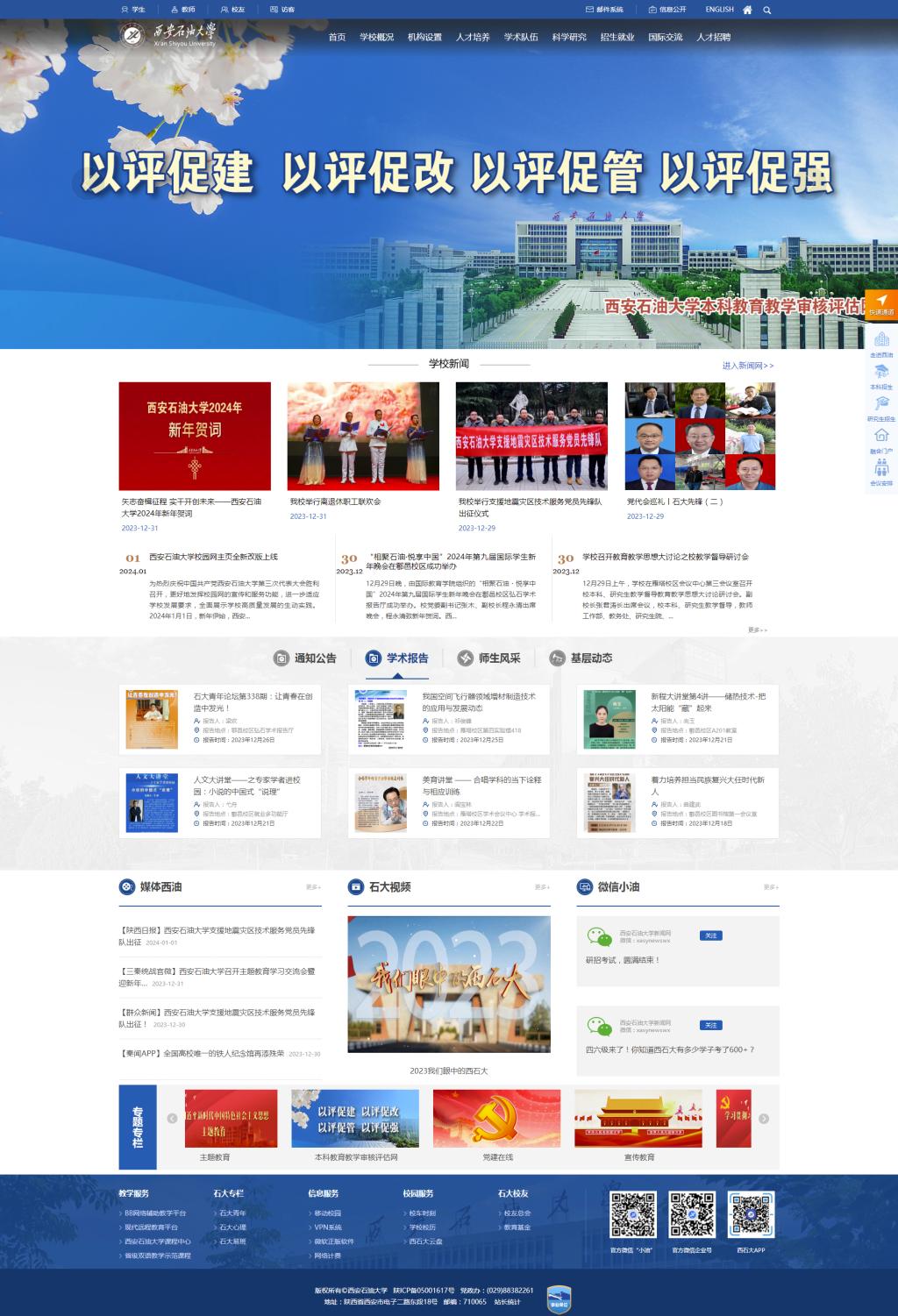 新版校园网主页版面增宽,更加彰显高水平大学的开阔度和主流设计趋势;右侧增设悬浮式快速通道等导航栏,便携用户操作,增强阅读体验;优化通知公告、学术报告、师生风采、基层动态等栏目架构,使版面更加简洁;采用图文方式展现学术报告、师生风采,更加直观生动;增设石大视频、微信小油等新媒体栏目使内容更充实,紧跟时代潮流。新版主页更好地展示了学校加快推进高水平研究型大学建设和各项事业高质量发展的奋进篇章。