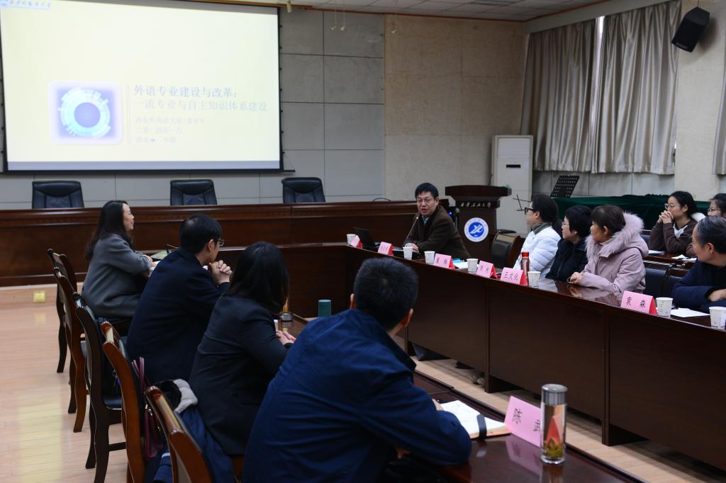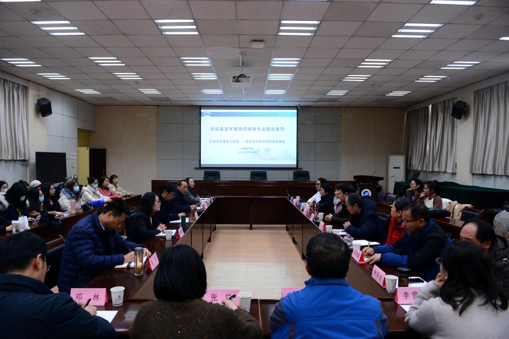 为迎接新一轮本科教育教学审核评估,做好迎评促建,扎实推进外语专业建设及英语国家级一流本科专业建设点验收准备工作,beat365官网邀请西安外国语大学副校长姜亚军教授来校指导外语专业建设。1月16日下午,在雁塔校区会议中心第三会议室开展了题为“外语专业建设与改革:一流专业与自主知识体系建设”的报告会及交流座谈。beat365官网副校长苏文甫、张君涛出席会议。外国语学院班子成员、各专业带头人及负责人、系部主任及所有任课教师参加了会议,会议由外国语学院副院长刘辉主持。