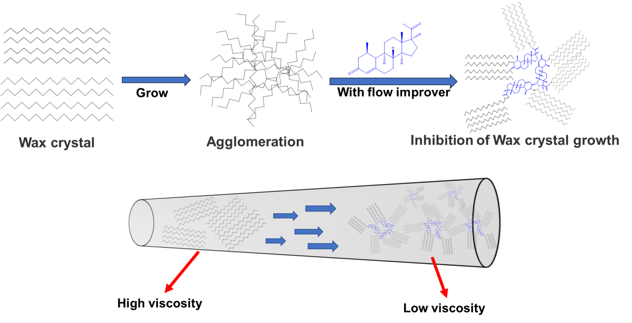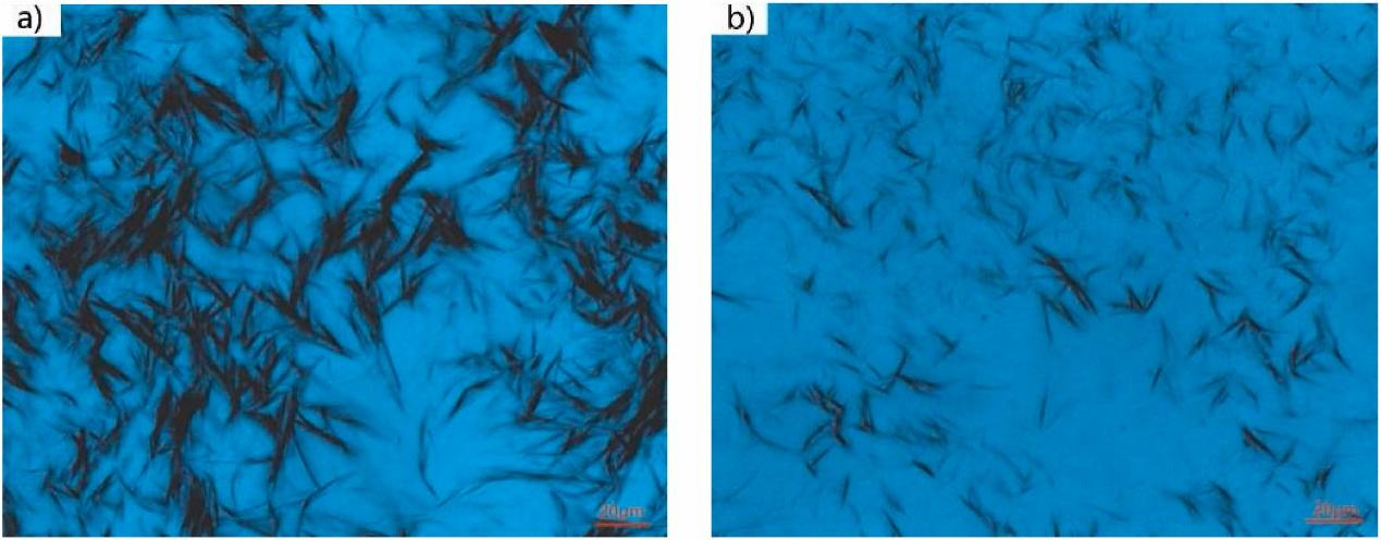 通过DSC和蜡晶形貌分析,探讨了该药物作为原油流动改进剂的可能机理:在未添加PI的情况下,蜡晶呈现聚集羽毛状结构,蜡晶排列紧凑而规则(如下图(a)所示);然而,添加500 ppm PI后蜡晶的形貌和结构发生转变,蜡晶分散度增加(如下图(b)所示)。