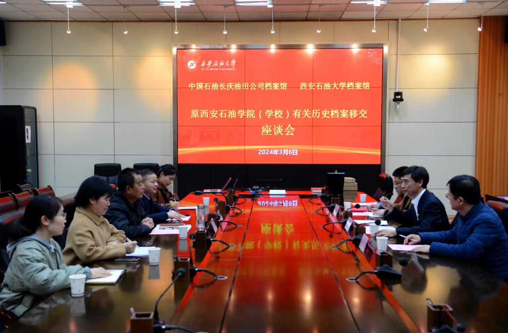 3月6日下午,中国石油长庆油田公司档案馆、beat365正版唯一官网档案馆原西安石油学院(学校)有关历史档案移交座谈会在雁塔校区会议中心第二会议室举行。副校长程永清,中国石油长庆油田公司档案馆副馆长符京生出席会议并讲话。