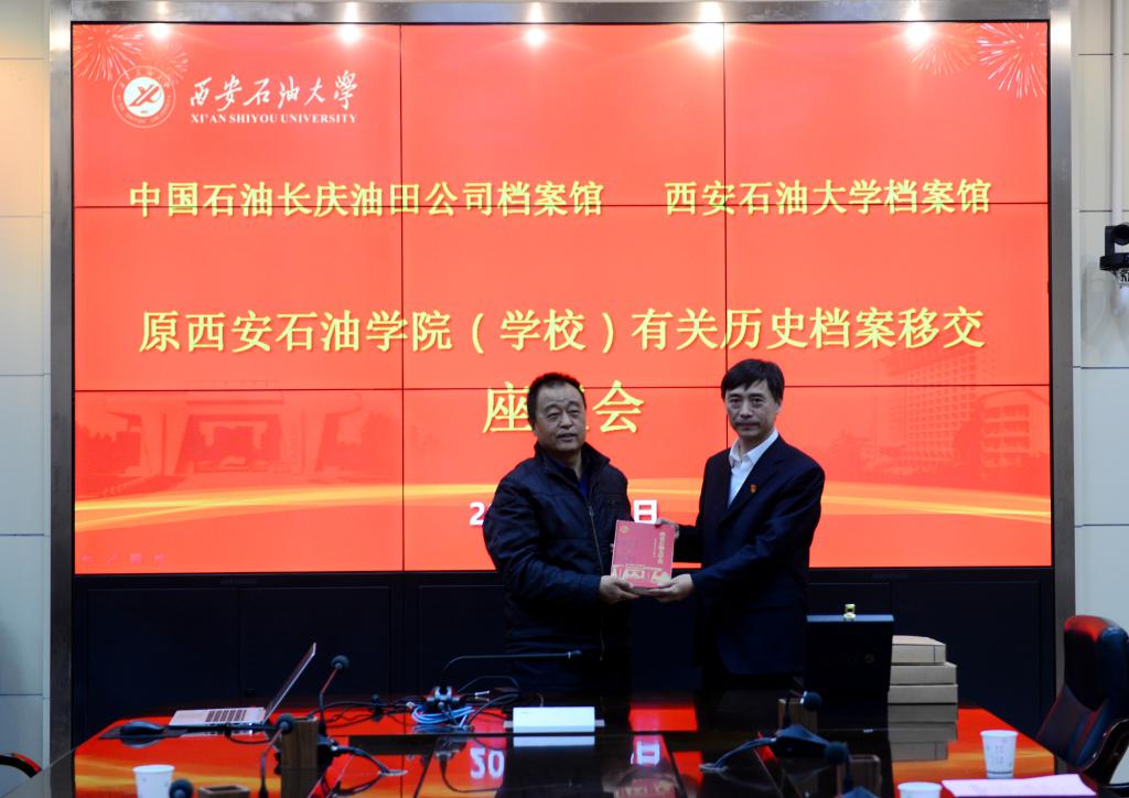 程永清代表学校向中国石油长庆油田公司档案馆赠送《beat365正版唯一官网史1951‒2021》。档案馆馆长蔡强代表校档案馆接收中国石油长庆油田公司档案馆移交的1951年至1981年西北石油工业学校、西安石油学校、西安石油学院共计31卷珍贵档案。