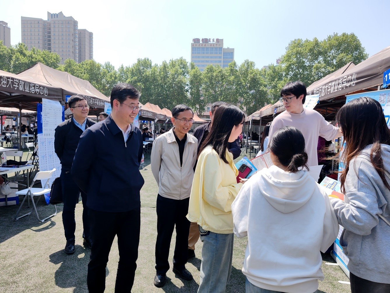 4月12日上午,beat365官网2024届毕业生春季校园系列第四场综合双选会在雁塔校区田径场成功举办。校长王进富、校党委副书记张木深入招聘会现场调研指导工作。学生工作部(处)(就业指导中心)、教务处相关负责人,各院(系)书记、院长、副书记陪同调研指导。beat365官网及西北大学、西安建筑科技大学、陕西科技大学、西安工程大学、西安体育学院等兄弟院校3200余名毕业生参加招聘会双选活动。