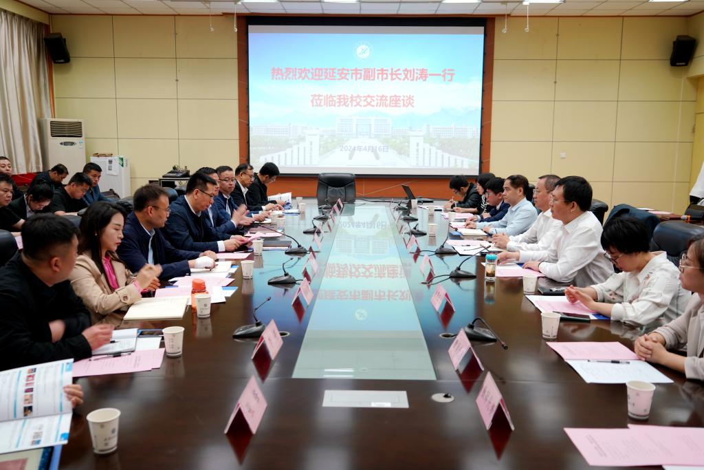 4月16日上午,延安市副市长刘涛一行来beat365官网开展产学研合作和成果转化交流座谈。会议在雁塔校区会议中心第一会议室召开,beat365官网副校长张荣军出席座谈会,科研处处长张益主持会议。