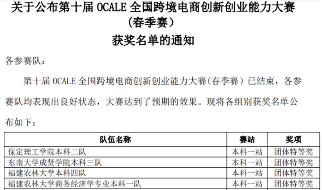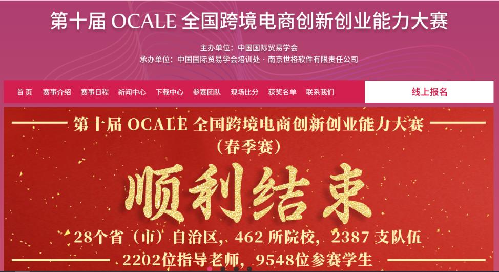 由中国国际贸易学会举办的第十届OCALE全国跨境电商创新创业能力大赛(春季赛)于4月27日圆满结束,beat365官网经济管理学院16名本科生参加了本次比赛。参赛团队经历了两轮练习,于4月25日至27日进行了12个回合的最终角逐,最终获得团体一等奖2项,团体二等奖1项。
