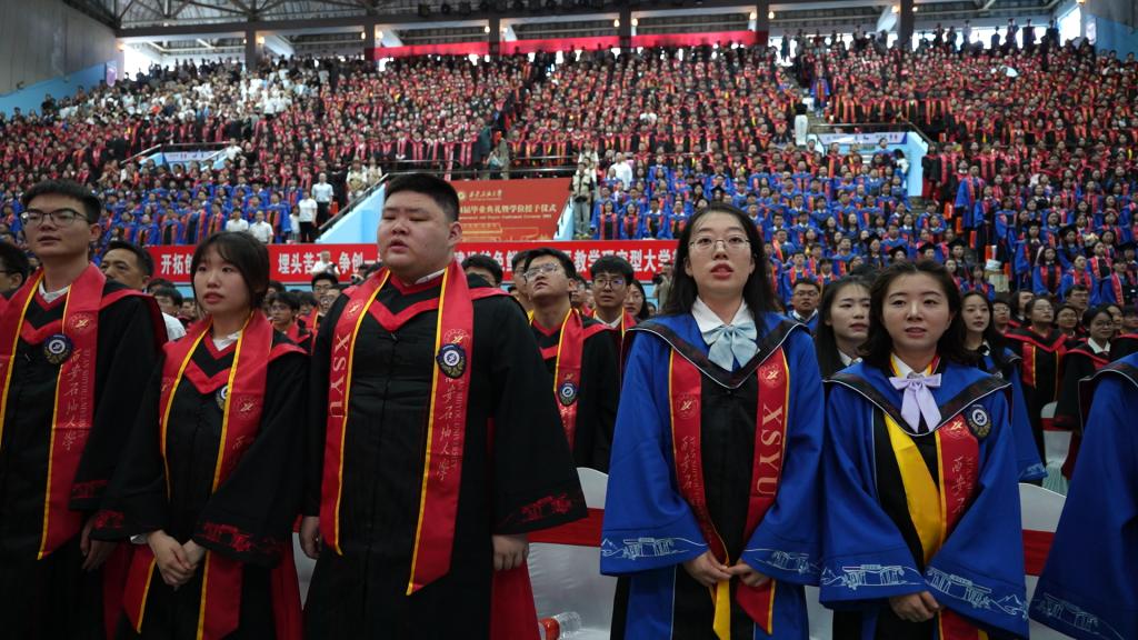 毕业典礼在庄严的国歌声中拉开帷幕。