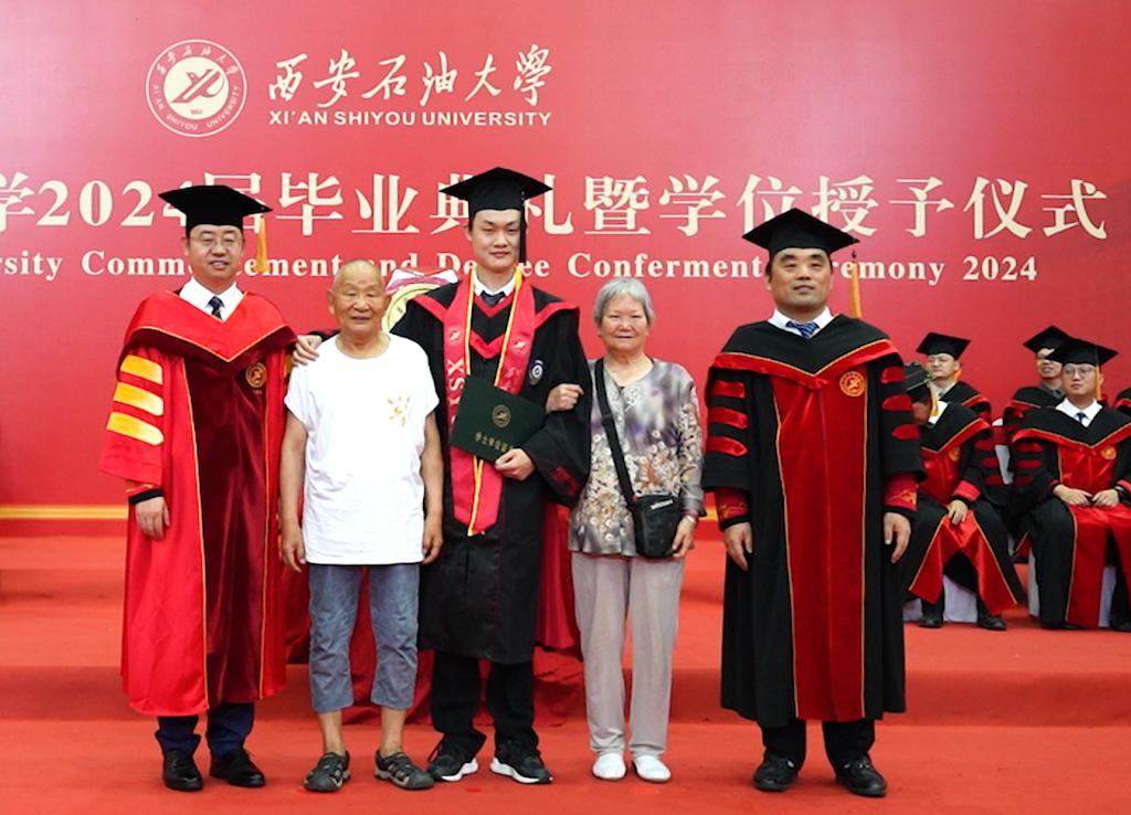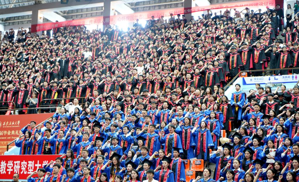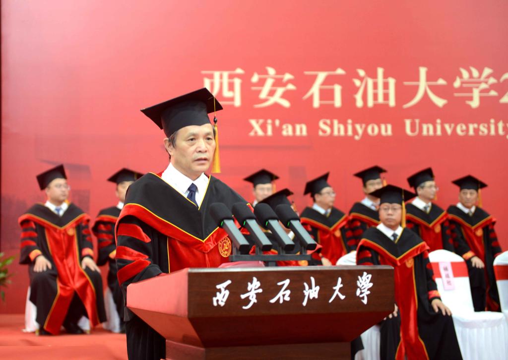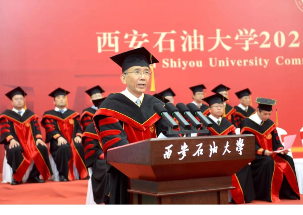 校长王进富为2024届毕业生致辞。他代表学校用这场隆重的毕业典礼、精心设计的专属学位服,向2024届5705名圆满完成学业、取得学位的优秀学子表达爱与祝福、感谢与期待;向春风化雨、寸草春晖的老师、父母们以及18万校友们表示最衷心的感谢和最崇高的敬意。王进富以《远观、问道、登顶》为题,嘱托勉励毕业生:一是作为新时代青年,要用开阔的视野远观伟大的征程,用新时代的历史方位调整自己的人生航向,披荆斩棘、乘风破浪。在伟大的时代坚定奋斗的信念,在实践锻造中不断增强做中国人的志气、骨气和底气,不畏艰难,无畏风雨,用“我为祖国献石油”的铮铮誓言为人生定义,在青春的赛道上创造无愧于党、无愧于人民、无愧于时代的新业绩;二是新征程上,要追寻求是之道,善于运用马克思主义的显微镜和望远镜观察社会、观察世界,认真研究事物内在联系,准确把握事物发展规律,拨开现象、察看本质,作一名洞察世事、清醒睿智的人。直面问道能源勘探开采主战场,开拓能源开发利用新阵地,探索创新之道,以创新精神发现“好油藏”、开展“新勘探”,实现“真开采”,保障“优储运”,做到“精炼化”,为服务国家能源战略贡献西石大智慧和西石大力量。三是登顶的路上,要坚持不懈,做一个坚定的行动派,跑出自己的加速度,为实现人生理想勇敢攀登,让青春在创新创造中闪闪发光;要追求卓越,不断学习、不断进步,不断追求、不断攀登,永葆热爱、怀揣梦想,行而不辍、履践致远,努力成为更好的自己,努力建设更好的中国。最后王进富寄语广大毕业生永葆赤诚之心,常怀感恩之心,胸藏悲悯之心,昂扬奋进之心,赓续红色血脉,弘扬铁人精神,望向曙光,奔向辉煌!