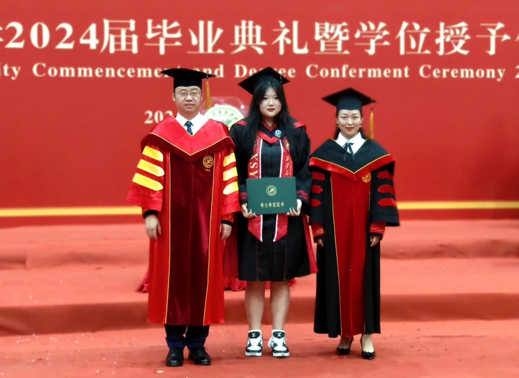 典礼上,校党委书记常江、校长王进富代表学校接受2024届本科毕业生“寸心基金”捐款和人文学院毕业生夏妍月捐赠的长卷书法作品——“《礼记·大学》全文”。