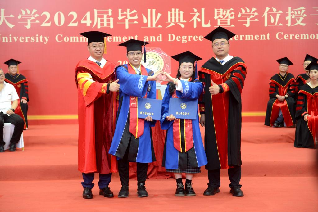 与会校领导、学位评定委员会委员和嘉宾为获奖者代表颁发证书、为年级理事代表颁发了聘任证书并给优秀毕业生代表赠送了“原油”印章纪念品。