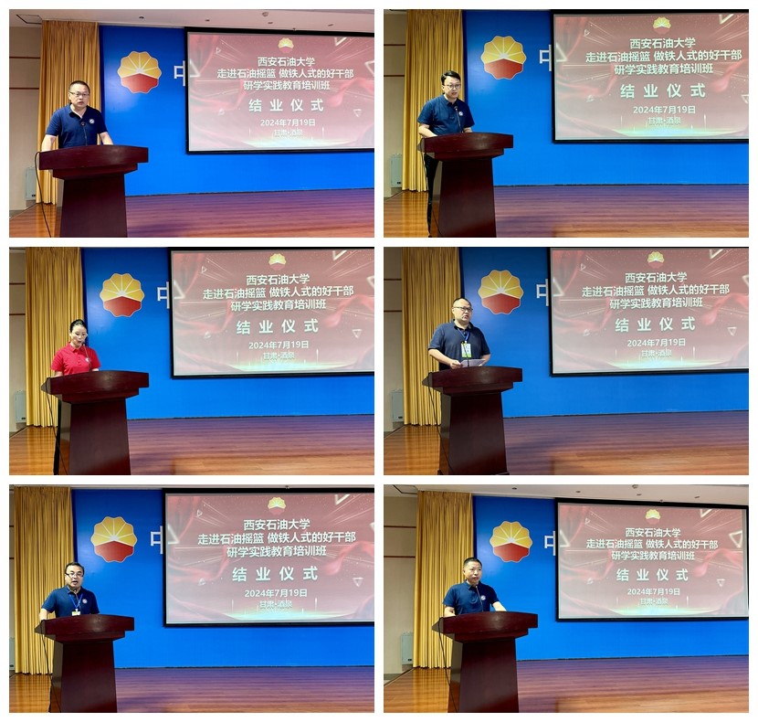 7月19日上午,在培训班结业仪式上,6名小组代表赵子龙、党伟、何云、范峥、吴松、苟毅飞围绕本次培训主题进行了交流发言,玉门油田培训中心领导为学员代表颁发结业证书,结业仪式在《我为祖国献石油》合唱中圆满结束。