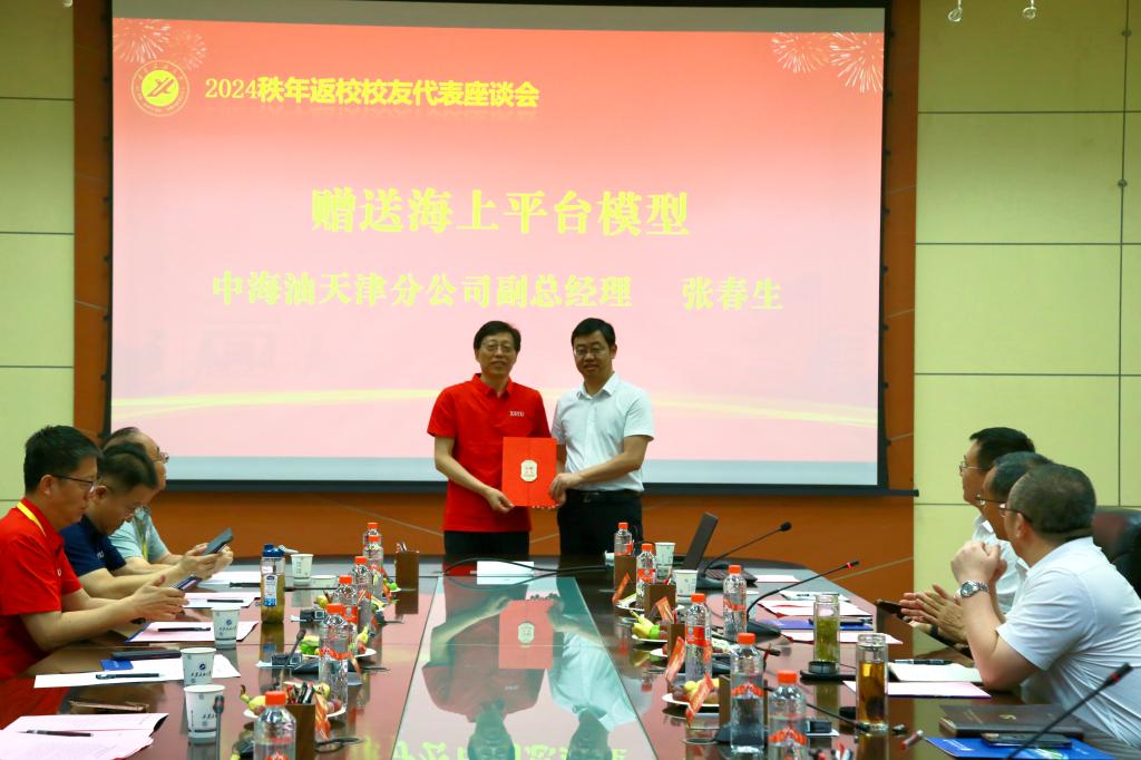 中海油天津分公司张春生校友向学校赠送了海上平台模型,王进富代表学校接受捐赠并为张春生校友颁发了捐赠证书。