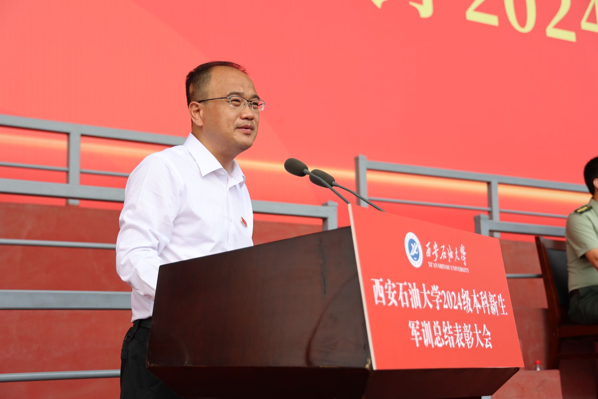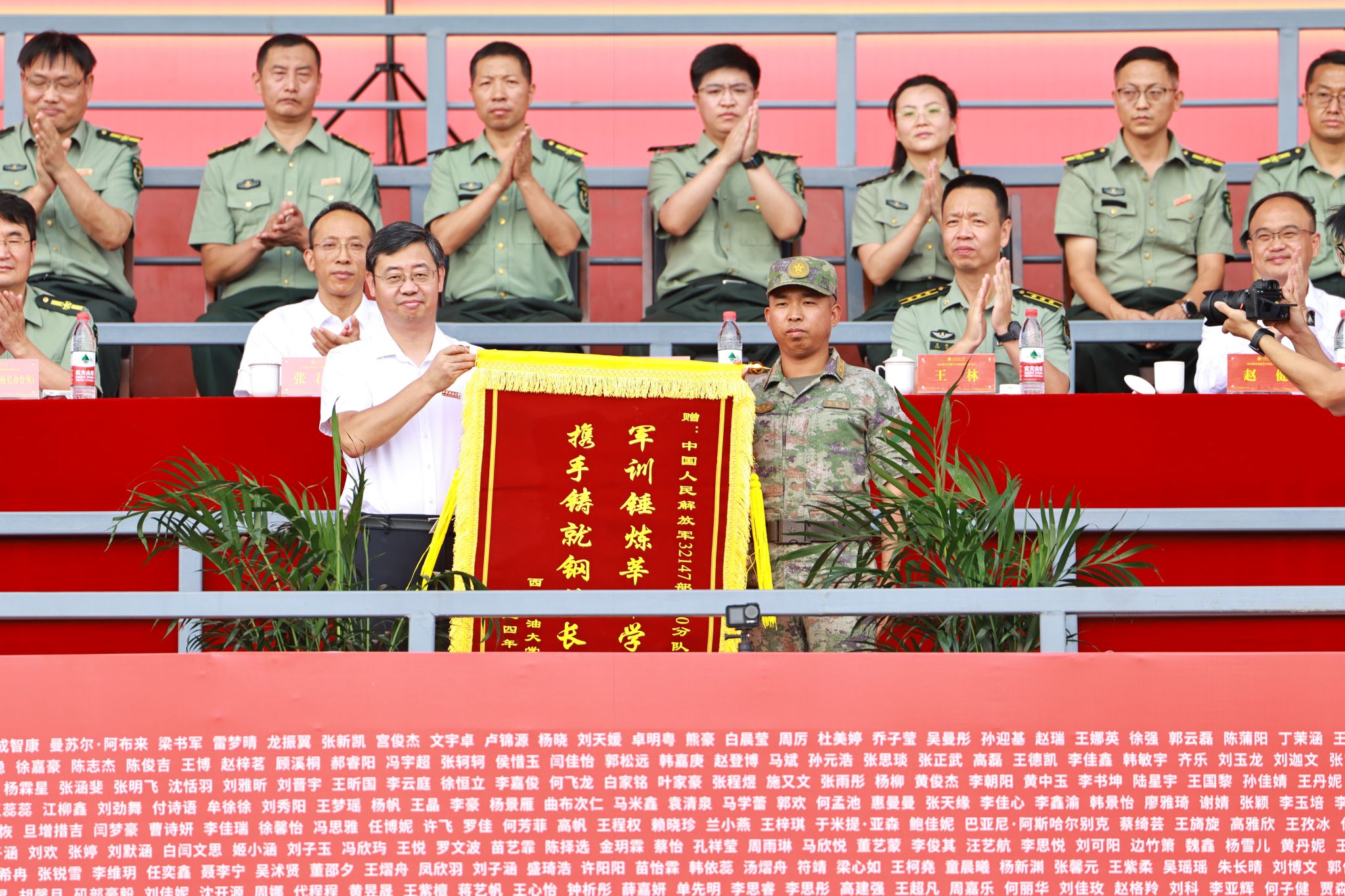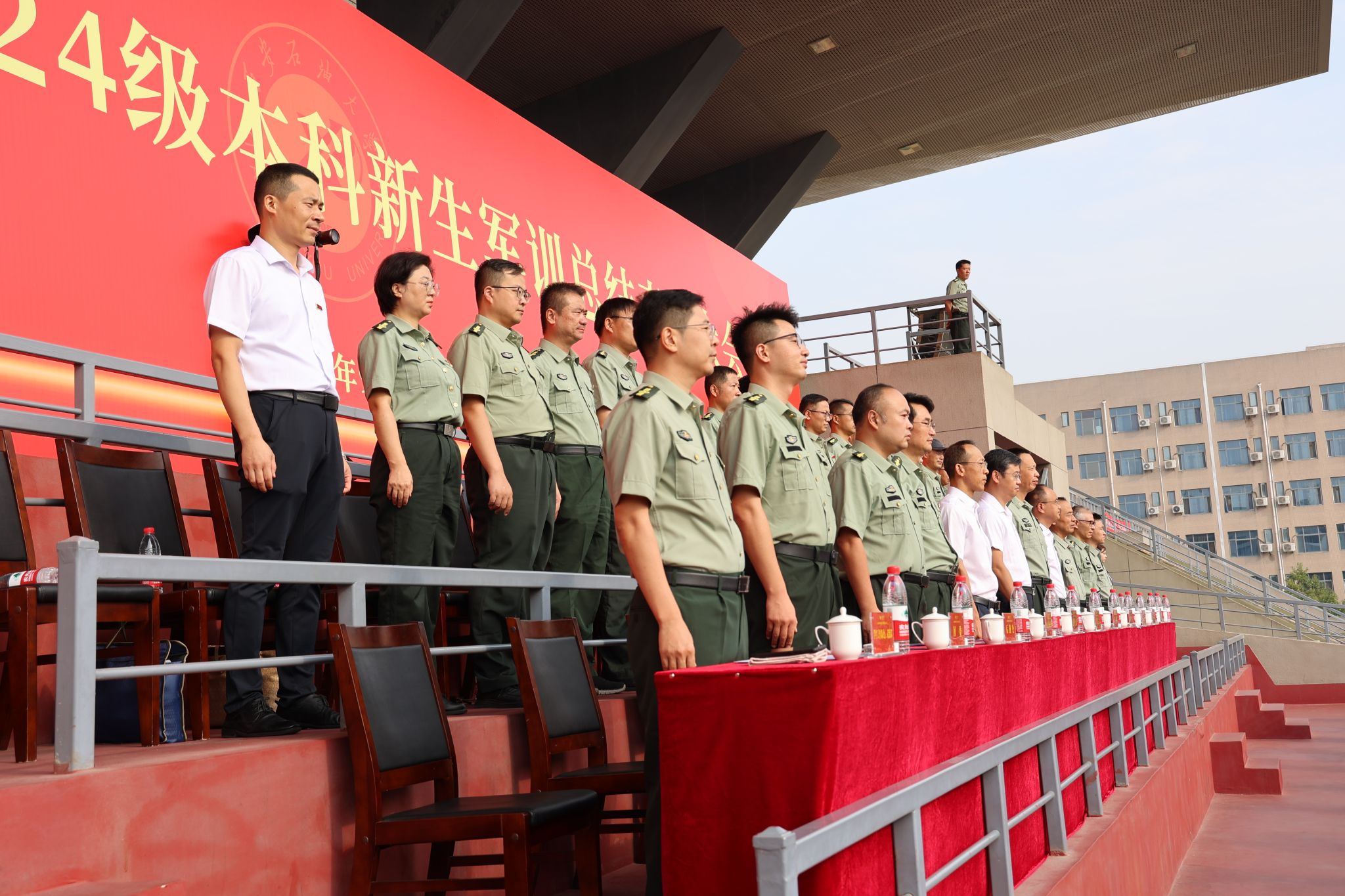 军训领导小组组长赵健发表讲话。他代表学校对承训部队全体教官表示感谢,对参训师生圆满完成军训任务表示祝贺,对本次军训工作取得的成绩表示肯定。并向全体2024级参训学生提出三点希望:一是希望同学们坚持“立德立身、立言立行”的思想修养;二是希望同学们秉持“好学力行、自强不息”的躬耕态度;三是希望同学们树立“胸怀天下、立鸿鹄志”的远大理想。