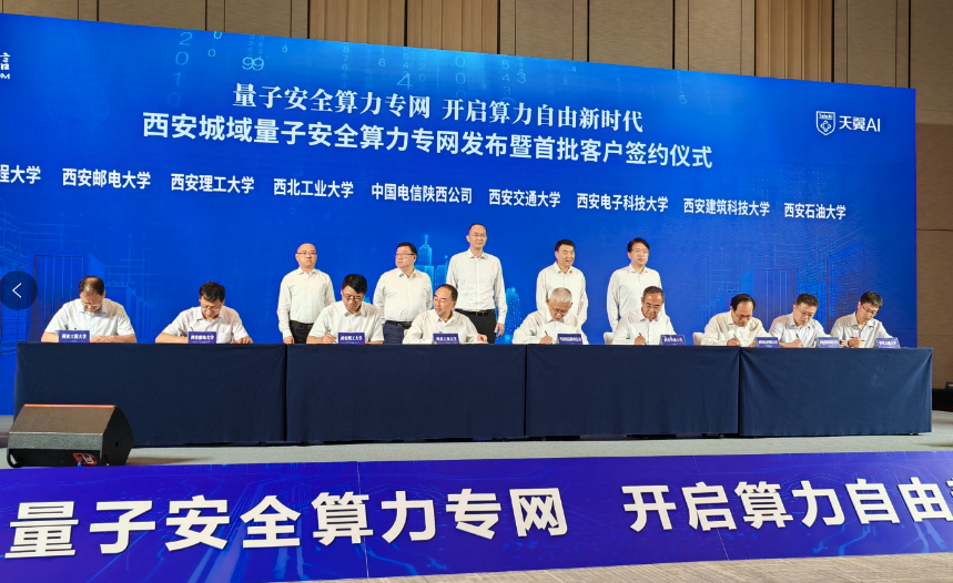 9月19日上午,中国电信全国首个城域量子安全算力专网发布会暨首批客户签约仪式在西安举办,本次会议的主题是“量子安全算力专网、开启算力自由新时代”。西安市人大常委会副主任李宁君,中国电信集团有限公司党组成员、副总经理李峻,陕西电信党委书记、总经理上官亚非,陕西电信党委副书记、副总经理王磊及相关企业代表出席会议。beat365官网校长王进富、副校长苏文甫应邀参加会议。