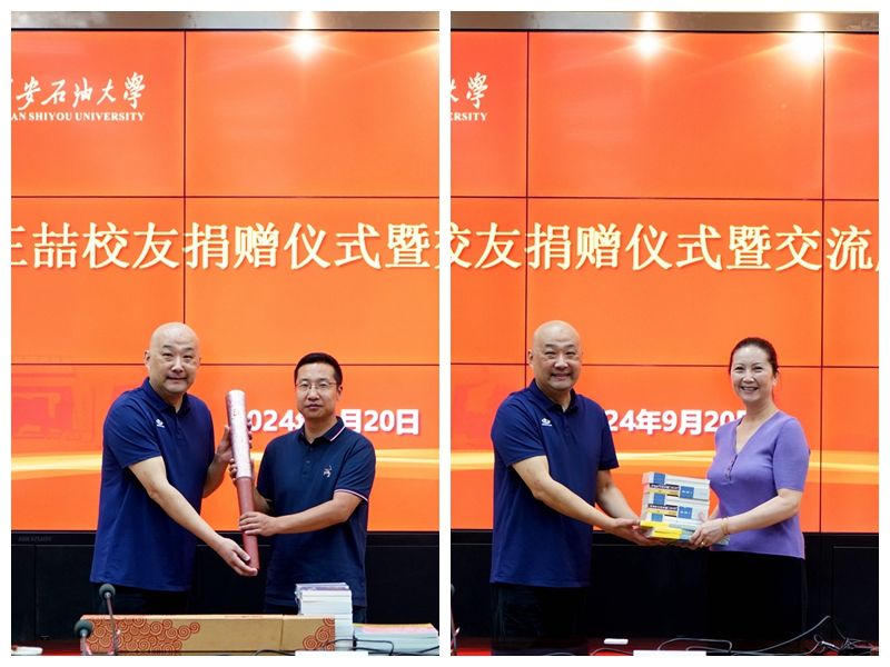 张木向王喆颁发捐赠证书和校史。他强调,学生是学校的中心,教师是学校的主体,校友则始终是学校的宝贵力量。学校重视校友工作,加强构建校友工作体系,推动校友工作专业化、精细化发展,加快建设校友与母校情感共同体、事业共同体、命运共同体。希望全体西石大人凝心聚力,共同奋斗,为母校多争荣誉,为国家多做贡献。