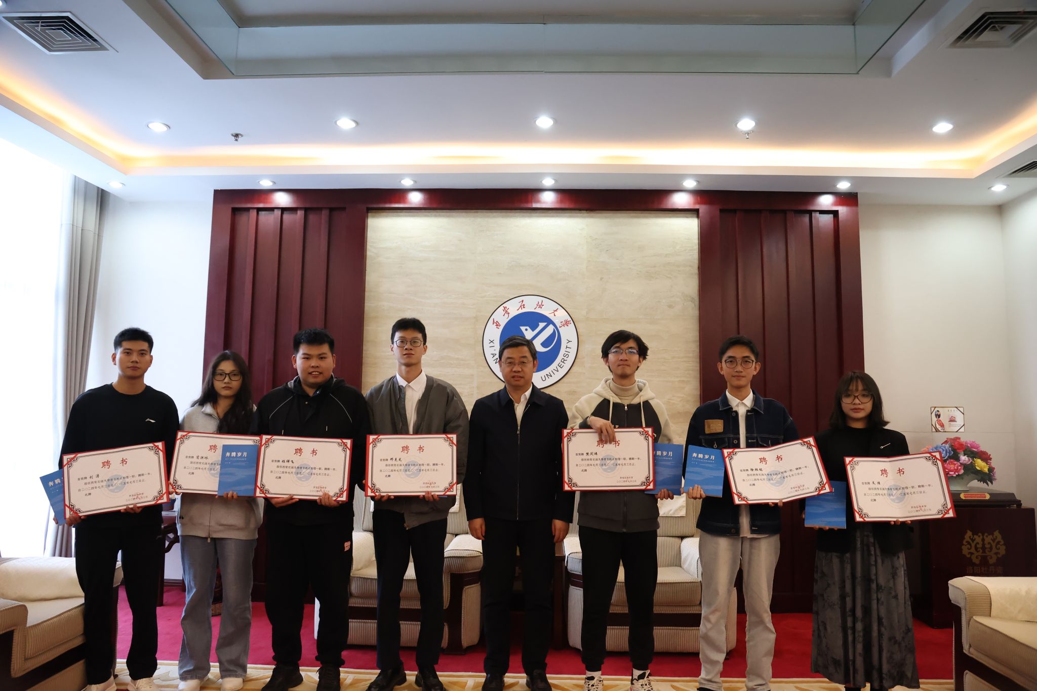 最后,王进富为姬祥飞等7位学生校长助理颁发聘书并分别赠送书籍《奔腾岁月》。他向受聘同学表示祝贺并强调,学生校长助理在促进学生成长和学校建设中发挥积极作用,应促进学生和学校的双向沟通互动,做学生心声的收集者和传递者,做学校政策的宣传者和践行者。他勉励受聘同学肩负好职责使命,在学习和实践中锤炼本领、增强能力、塑造品格,成长为有理想、敢担当、能吃苦、肯奋斗的当代大学生。并要求相关单位充分重视学生校长助理在改进部门工作、推进民主治校中的作用,推动学生校长助理工作做实做细。