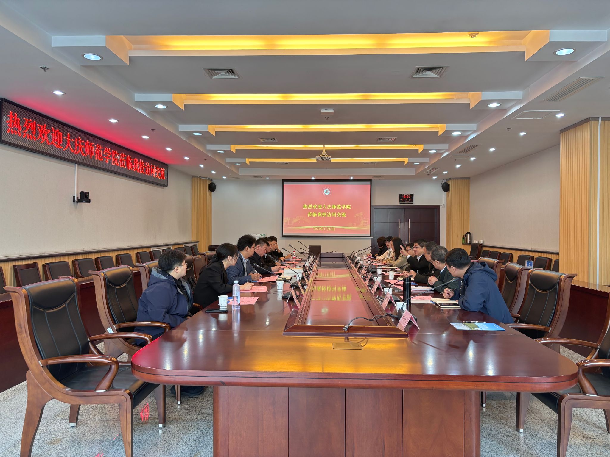 随后,与会人员围绕财务管理、科技成果转化、铁人精神研究与实践等方面进行了深入交流和研讨。财务处分享了财务管理和资金筹措等方面的经验和困难,石大资产经营公司分享了科技成果转化方面的积极探索和成效,马克思主义学院、人文学院、音乐系分别介绍了各自在铁人精神理论研究、课程思政融入、校园文化建设等方面的成果。大庆师范学院对此表示高度赞赏,他们表示,铁人精神作为两校共同的精神财富,应深入挖掘其时代价值,通过联合申报项目、开设特色课程和社会实践项目等形式,共同推动铁人精神的传承与创新发展。整个交流过程气氛热烈,双方均表示收获颇丰,不仅增进了相互了解,也为未来合作奠定了坚实基础。