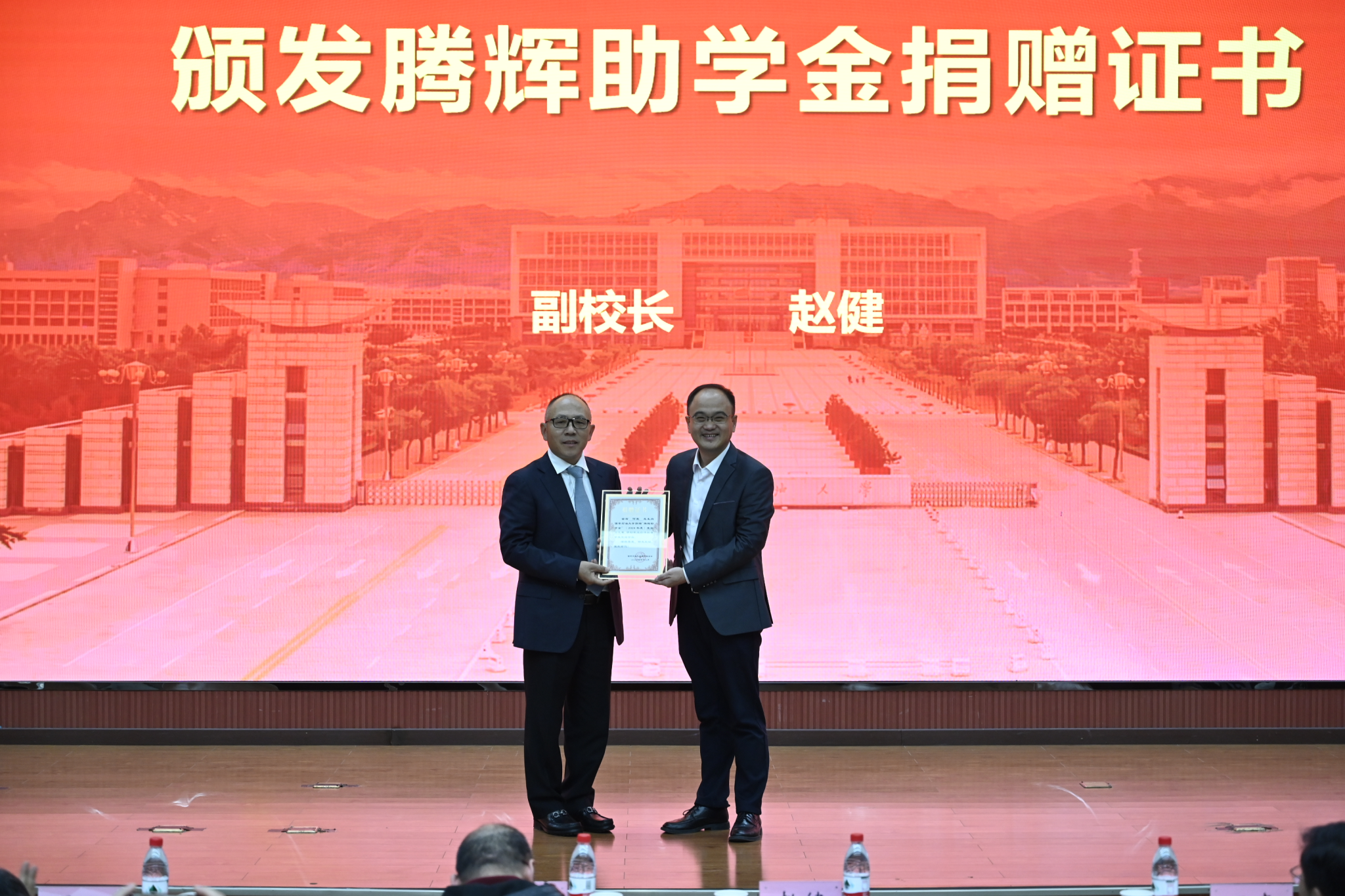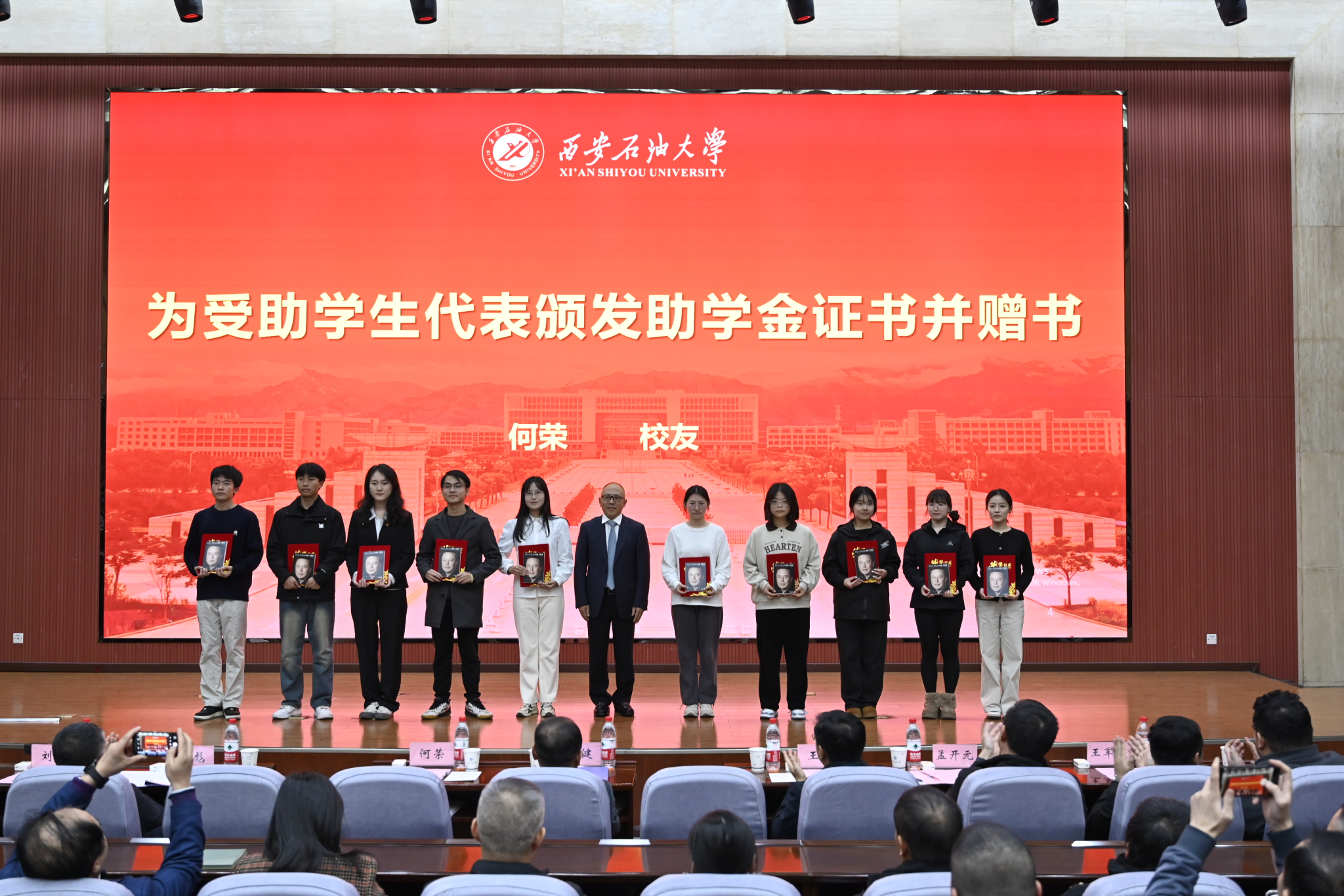 在助学金发放仪式上,赵健在讲话中深情回顾了何荣校友在校的优秀表现,充分肯定了何荣校友和窦益华老师共同出资设立腾辉助学金的善行义举,特别是为广大同学们提出了三点殷切的希望:一是要感恩怀德,自强不息。要时刻保持一颗感恩的心,珍惜腾辉助学金给予同学们的精神上的鼓舞与激励,把它转化为强大的动力,自强不息,立志成才,以实际行动回报社会,传递爱心;二是要志存高远,艰苦奋斗,秉承石油人的优良传统,顽强拼搏,做好自己的知识储备和能力提升,脚踏实地健康成长;三是要知行合一,以知促行、以行求知,增强自我成才意识,提升综合素质,努力将自己塑造成为德智体美劳全面发展的中国特色社会主义事业的合格建设者和可靠接班人。